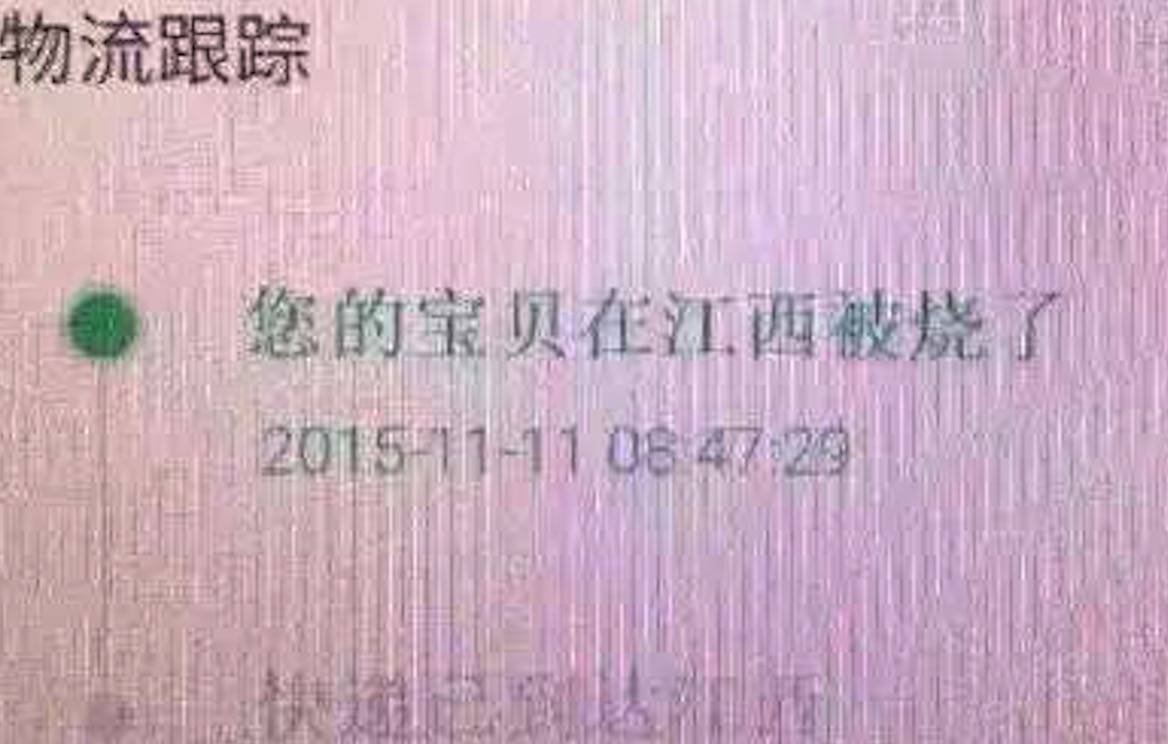 另外,11月12日,江西昌铜高速一辆运快递的货车着火,车上4000多件快递基本报废…快递公司表示,对于被毁快递,顾客只要提供单号,将重新发货或照价赔偿。交警表示,货车起火原因是货物自燃,建议应将电子产品分开运送。嗯,因此很多网友在追踪订单时,收到了这样一条提醒:“您的宝贝在江西被烧了”#来自快递蜀黍的幽默#