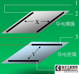 触摸屏的两个金属导电层是触摸屏的两个工作面,在每个工作面的两端各涂有一条银胶,称为该工作面的一对电极,若在一个工作面的电极对上施加电压,则在该工作面上就会形成均匀连续的平行电压分布。如以上层为X轴,(X+, X-)送出(5, 0)V的电压。