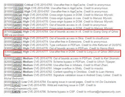 中国经济网12月3日讯 近日,Google进行了Chrome安全升级,发布41个安全补丁,此前在日本Pwn2Own Mobile上,360手机卫士安全研究员龚广攻破Nexus 6所使用的漏洞在本次漏洞修复之列,并受到了Google官方致谢,这也是龚广今年第四次获得Google官方致谢。据悉,龚广利用该漏洞,仅用2分钟就在大赛上攻破安卓最新系统Nexus 6手机,成为全球唯一一位在黑客大赛上成功攻破N6的白帽黑客。