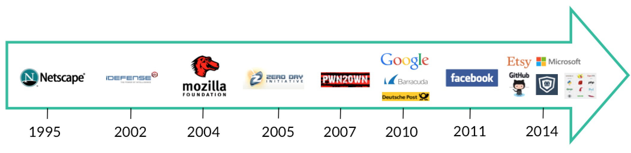 Netscape创办于1994年,因推出同名浏览器而闻名。1995年他们发布了互联网史上第一个漏洞赏金项目。谁能在新产品中找到安全漏洞,谁就能获得诱人的现金奖励。那时,公司的市场副总裁Matt Horner是这么解释这个项目的:“通过奖励那些能够快速找到并向我们汇报漏洞的用户,这个项目将鼓励公众对我们的新产品提出意见和建议,并帮助我们不断创造安全稳定可靠的产品。”
