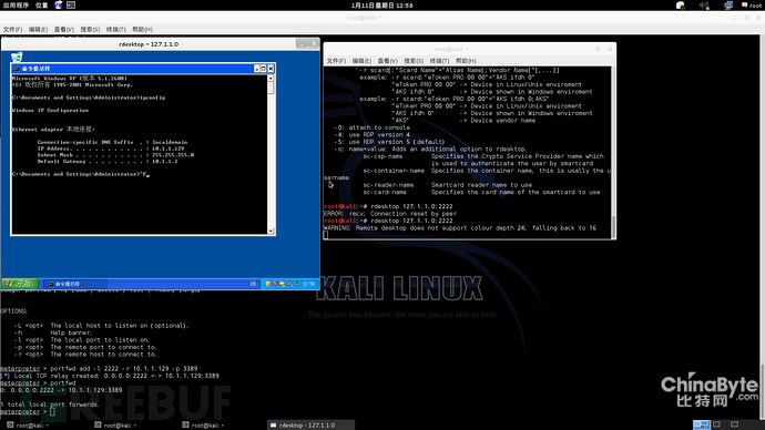 接着连接本地2222端口即可连接受害机器10.1.1.129 3389端口,如下: