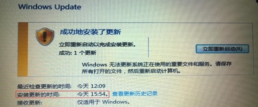 Ø 结束时间:在Windows Update 提示 “立即重新启动”的界面,查看 “安装更新的时间” ,这个是下载结束的时间。 例如,15:54