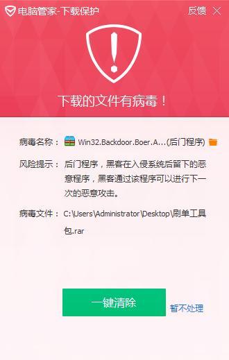 只要开着电脑就可以挣钱?近日,不少论坛、聊天群里出现了刷单挣钱的小广告,用户接收并下载对方发来的刷单软件,保持电脑一直开着就可以挣钱。腾讯反病毒实验室发现,一旦安装所谓刷单软件,电脑将会被黑客控制,严重危害电脑安全,目前,腾讯电脑管家已率先拦杀此木马。