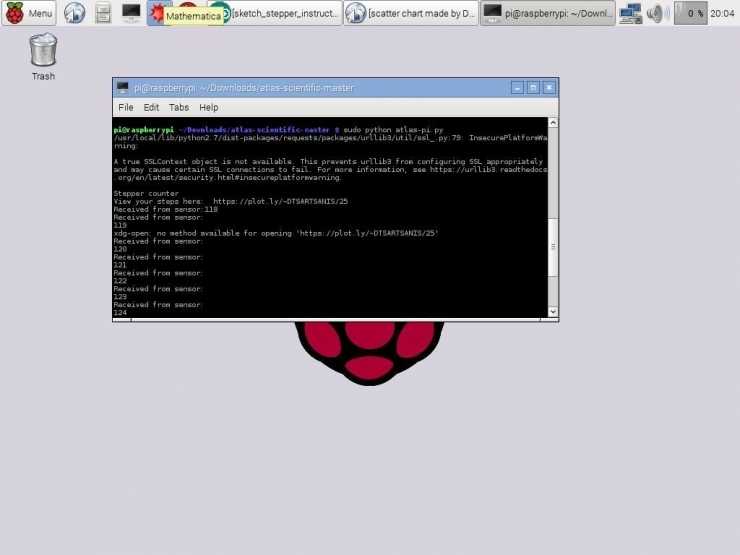 最后,把Arduino代码下载到你的Arduino中。打开一个终端,进入Atlas-pi 文件夹,键入sudo python atlas-pi.py,开始在踏步机上踏步。如果顺利的话,打开浏览器,你将可以看到并上传你的运动步数。你也可以找到该终端的流地址。