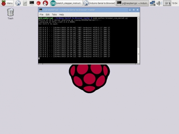 然后,在Arduino中载入刚刚做好的代码。打开终端,找到Arduino-Serial-to-Browser文件夹,键入指令:sudo python browser_vis_serial.py.