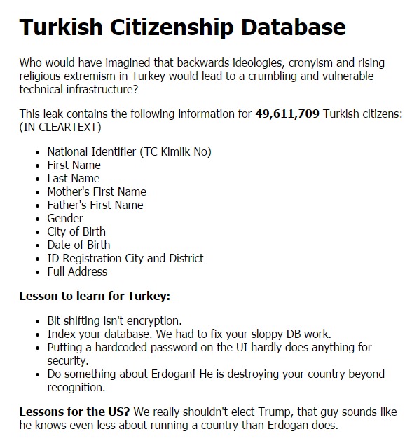 2、土耳其国家数据库的索引极烂;在泄露数据之余,黑客竟声称自己修好了数据库。