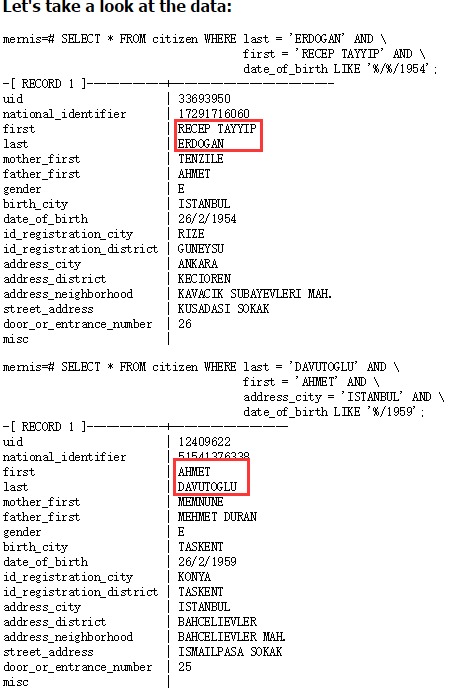 为了表明自己成功地黑进了官方数据库,黑客还引用了土耳其总统埃尔多安与总理达武特奥卢的个人信息作为例证。