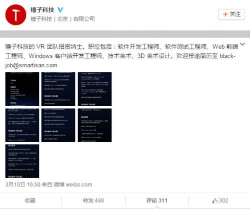 网友对这条微博的评论也非常风趣,比如“我会修电脑能去你哪里上班吗”、“锤子也要搞黑科技了”,大部分人都对锤子的VR产品还是很期待的。HTC Vive虚拟现实头盔热卖让一蹶不振的HTC股价反弹,反观智能手机行业已成一片红海,锤子若把握好这个机会也许能成功上位。