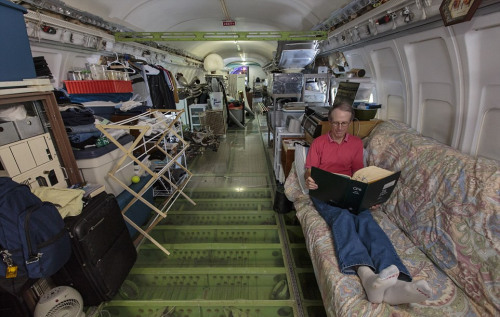 过去15多年,他一直在波特兰市郊一架改装成为住家的“波音727”飞机内生活,机上设备齐全,睡眠区放了婴儿床,设有厨房、洗衣房及浴室,改装工程费用约22万美元。