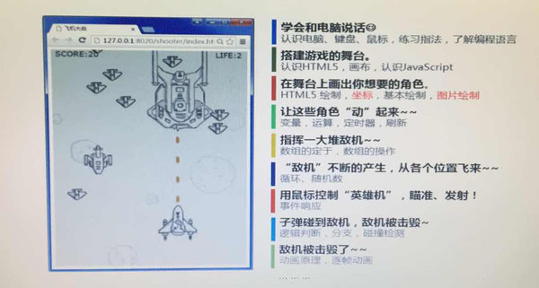 上图,是达内童程的老师“仿写”的几款热门游戏,老师希望用游戏来减少孩子对编程的陌生感。比如,在带领孩子“玩”游戏的过程中,老师会问孩子们:有多少种敌飞机?每种敌飞机需要几颗子弹消灭?等等。为后面的编程概念介绍做铺垫。