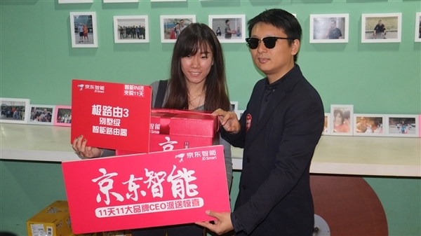 11&MIDdot;11即将来临,京东智能“11天11大品牌CEO派送惊喜活动”也已经进行到了第三天,CEO亲自上门送货已经给不少用户带来了惊喜,而今天的主角则是极路由创始人兼CEO王楚云,一袭黑色西装,炫酷的墨镜,化身骇客为今天的幸运用户送上神秘大礼。