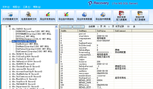 D-Recovery For MS SQL Server达思SQL数据库修复软件简单易用,操作界面尽可能接近MS SQL Server企业管理器。打开数据库文件以后,左边树状结构列出数据表、视图、存储过程、用户自定义函数、用户自定义数据类型。数据表是数据库文件的主要内容,左边树状结构罗列出所有的用户表,每个数据表包含有自己的所有字段信息以及从系统表中读取出来的该表的大致记录数量。当点击左边树状结构中的数据表,右边会显示出该表中的数据记录内容,如果该表数据内容较多,可以进行上下翻页浏览更多的数据记录信息。
