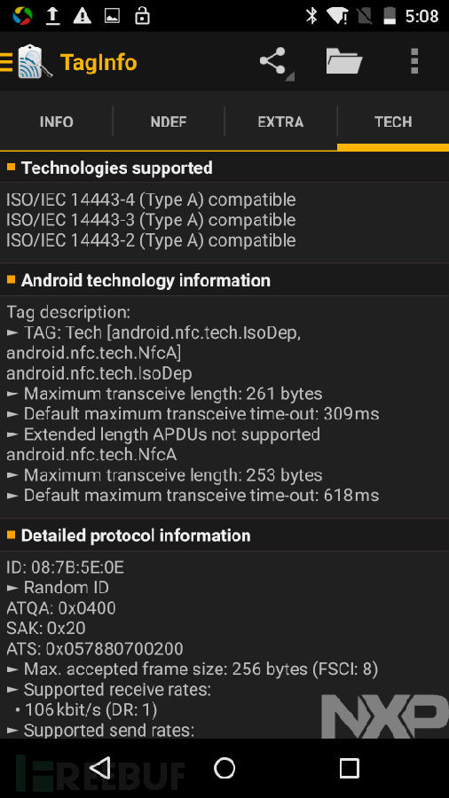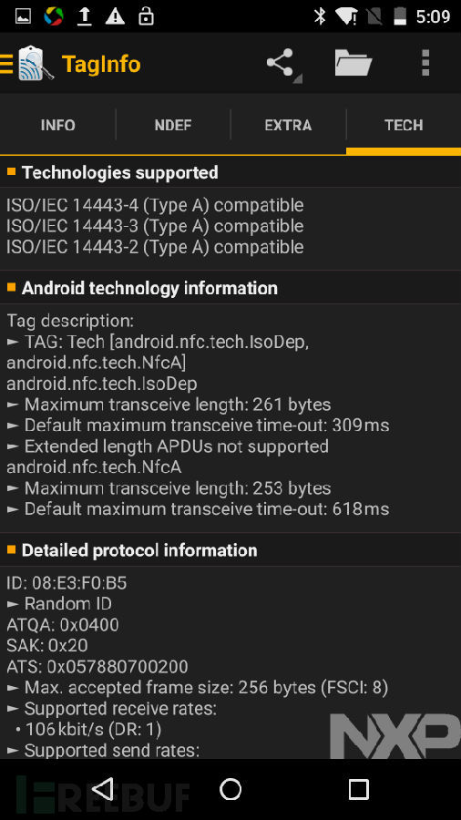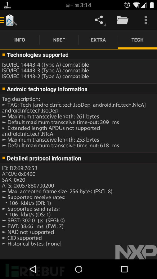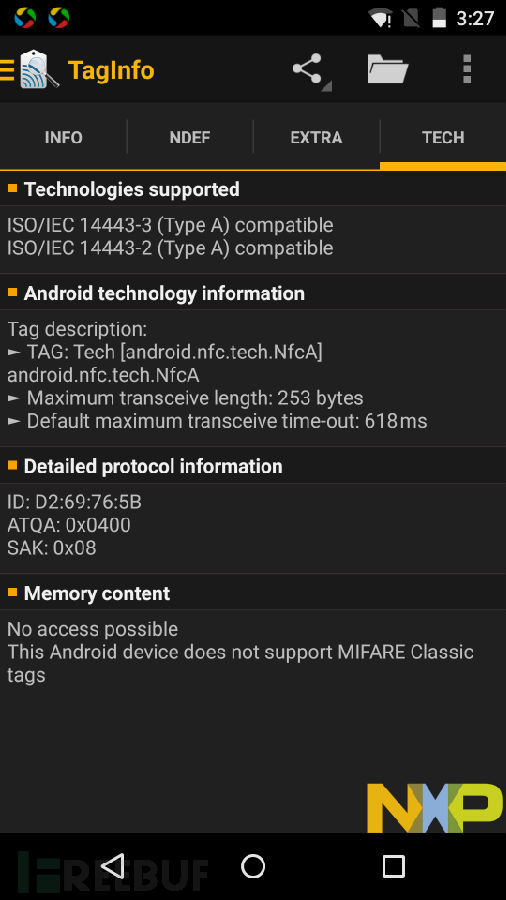 我们下载一款名为“TagInfo”的android应用,用它来读取一下现在可以刷开门禁的卡信息。(跟同楼的妹子借的)