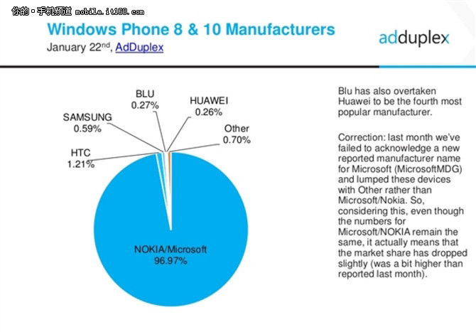 当然,HTC 10不去支持Win10 Mobile操作系统,绝不单是HTC的责任。根据IDC的最新统计报告显示,Windows手机去年只出货了1110万部,同比锐减18%,终端数量仅占总体的1%不到,甚至可以忽略。而且更糟糕的是,整个生态很不健康,应用匮乏,各个软件厂商也不跟进更新维护,导致硬件合作伙伴也是纷纷离去,微软(诺基亚)自己撑起了95%的规模。而在2016年1月份,微软(诺基亚)的占比更是达到几乎97%,颇有一些悲凉。