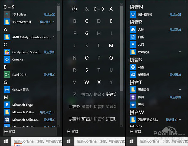 Win10开始菜单提供了两组检索模式,一是通过Cortana搜索框直接键入被搜索项字母,二是借助应用首字母快速筛选分类。这项功能位于【开始】-【所有应用】标签下,使用时只要根据首字母点击应用所对应的英文及拼音即可。需要注意的是,英文项目只对应于纯英文应用,而像【计算器】、【获取Skype】这样中英文混合的应用,则需要通过【拼音首字母】检索。