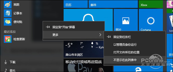 默认情况下,开始菜单左上角是由【最常用】和【最近添加】两个项目构成,目前Win10还不允许用户对这两个项目进行定义,我们唯一能做的就是右击应用图标,通过【不显示在此列表中】将其移出当前列表。