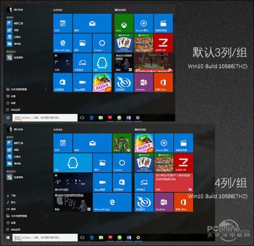 开启后,开始菜单由现行的三列一组改为四列一组,即在一组内同时排列四个中尺寸磁贴或两个宽尺寸磁贴。应该说这是一项专门针对于高清屏用户提供的设计,总体来讲还是十分实用的。