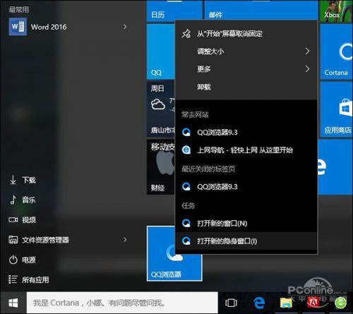Win10开始菜单支持跳转列表,比方说上文我们就是利用了它的文档固定功能。其实随着应用的不同,跳转列表里的内容也是不一样的,比方说QQ浏览器,当你右击它的开始菜单磁贴时,弹出的菜单里就包括了“打开新窗口”、“打开新隐身窗口”两组任务选项,以及“常去网站”、“最近关闭的标签页”两组标签选项。