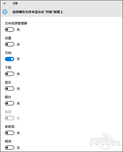 在【设置】-【个性化】-【开始】面板下,你会看到一段标识为【选择哪些文件夹显示在“开始”屏幕上】的蓝字提示。点击后,会出现一个包括【文档】-【下载】-【音乐】-【视频】的项目列表,简单来讲这个列表中的选项勾选后会出现在开始菜单左下方,取消勾选则不出现在开始菜单里!