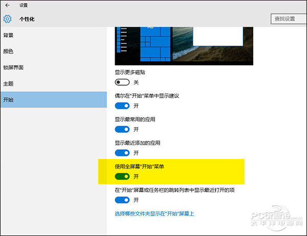 在【设置】-【个性化】-【开始】面板下,有一项【使用“全屏幕”开始菜单】的选项,勾选它之后,新版Win10开始菜单会立马变回Win8/8.1时代的全屏风格。嗯,你或许不喜欢,但总会有人喜欢吧?